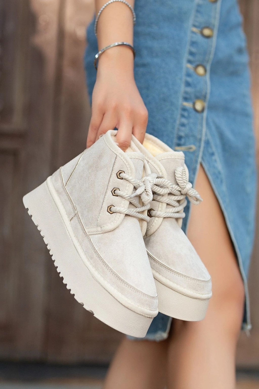 Lady İçi Kürklü Kalın Taban Bağcıklı Bej Ten Rahat Kadın Bot